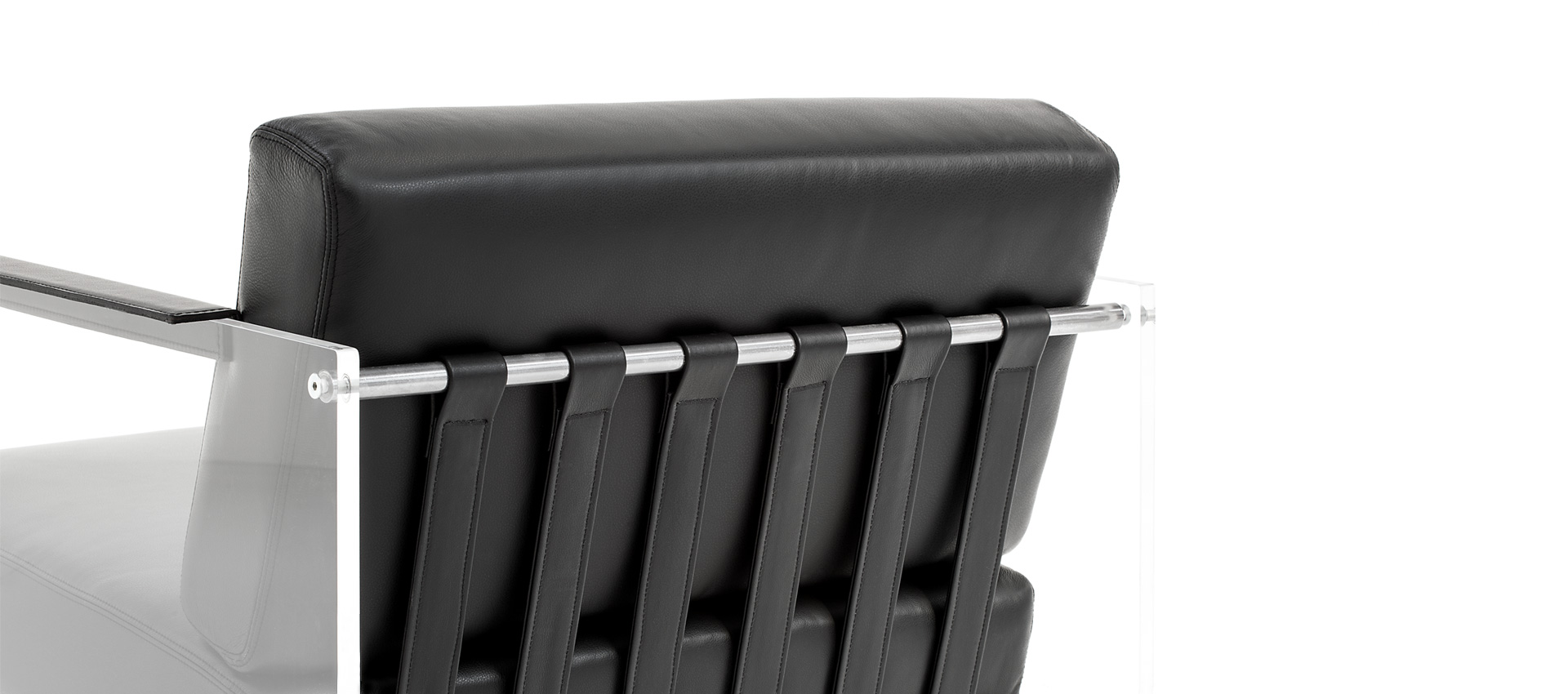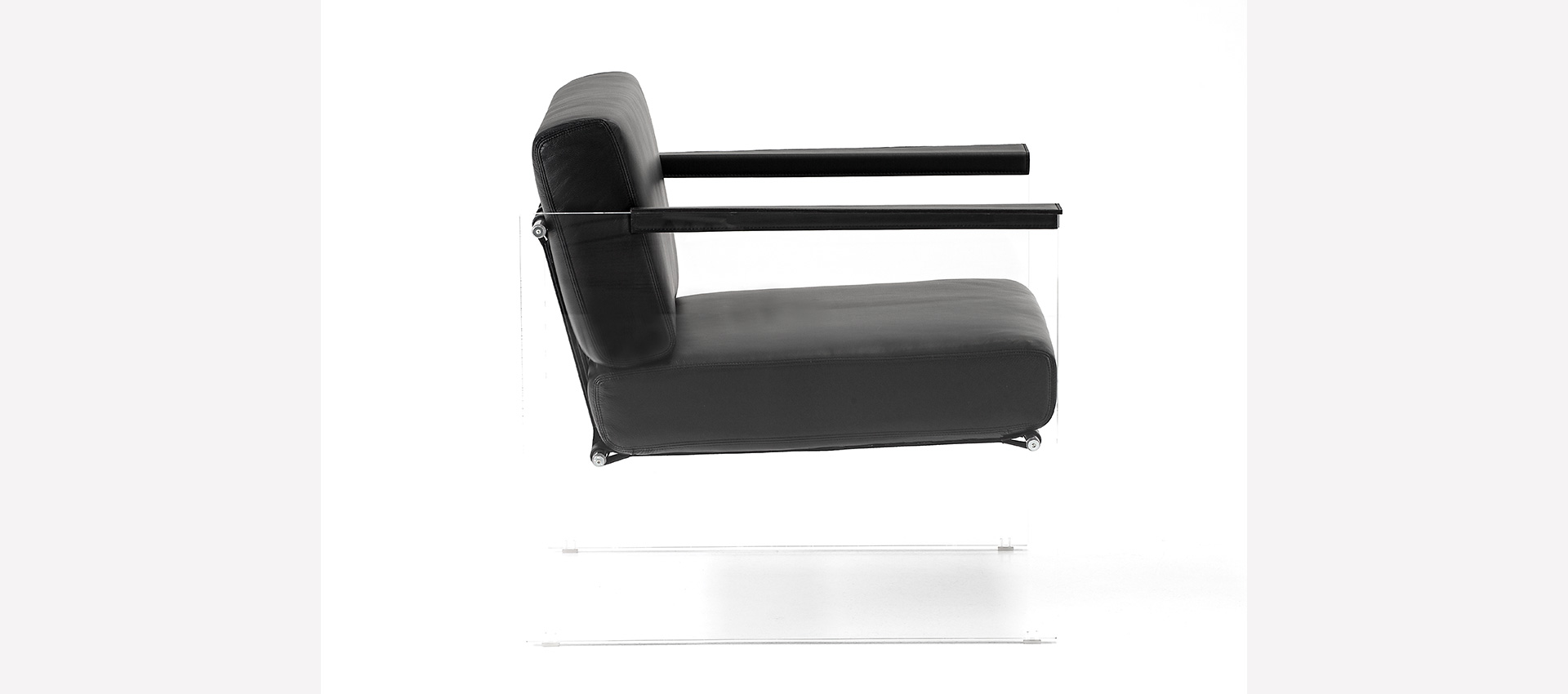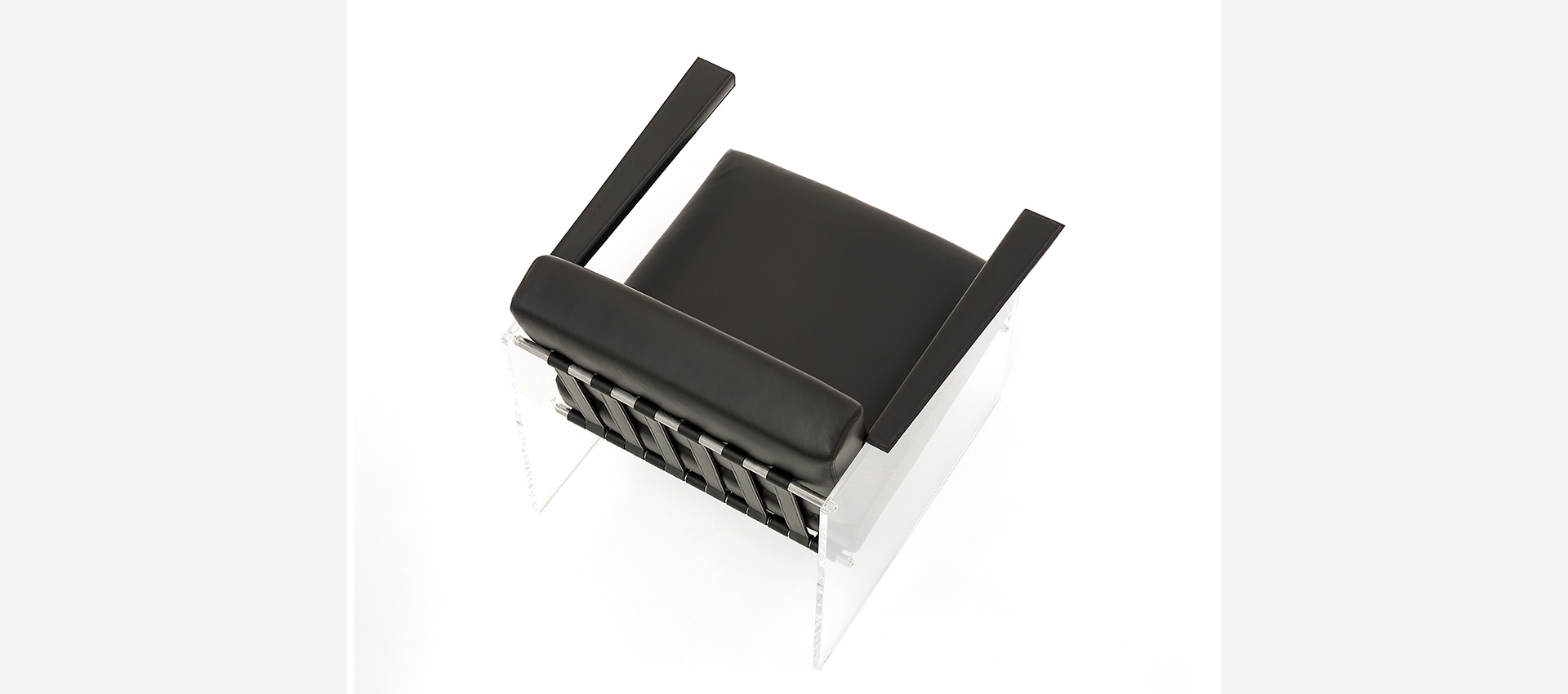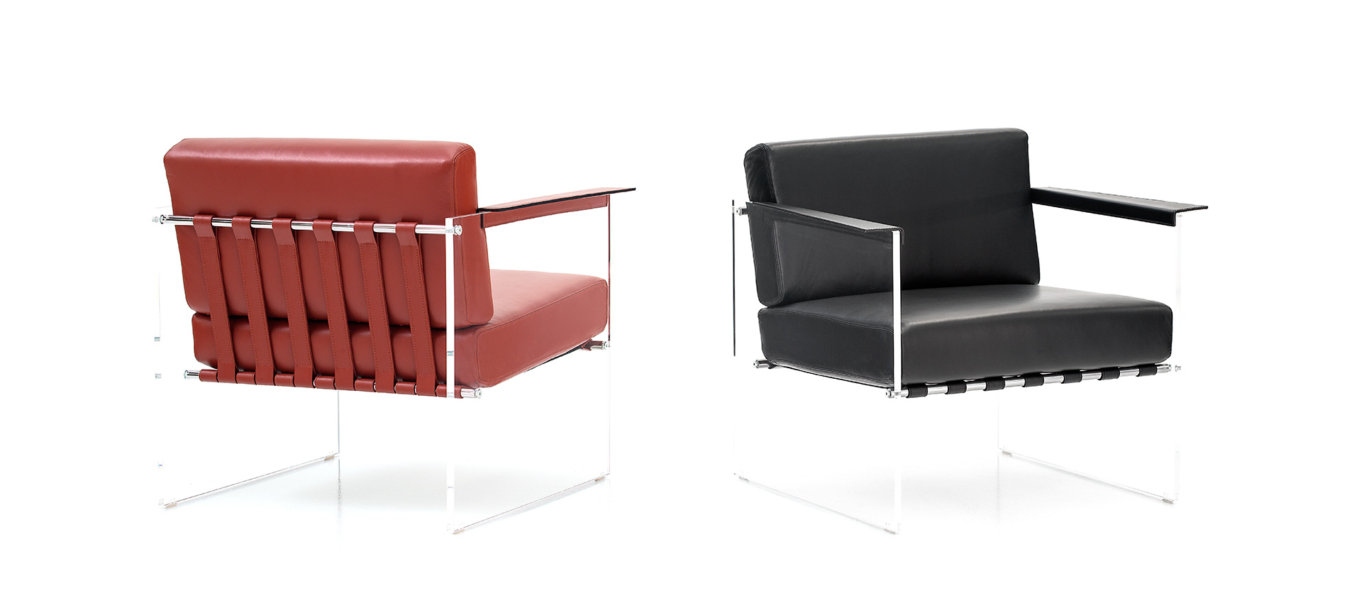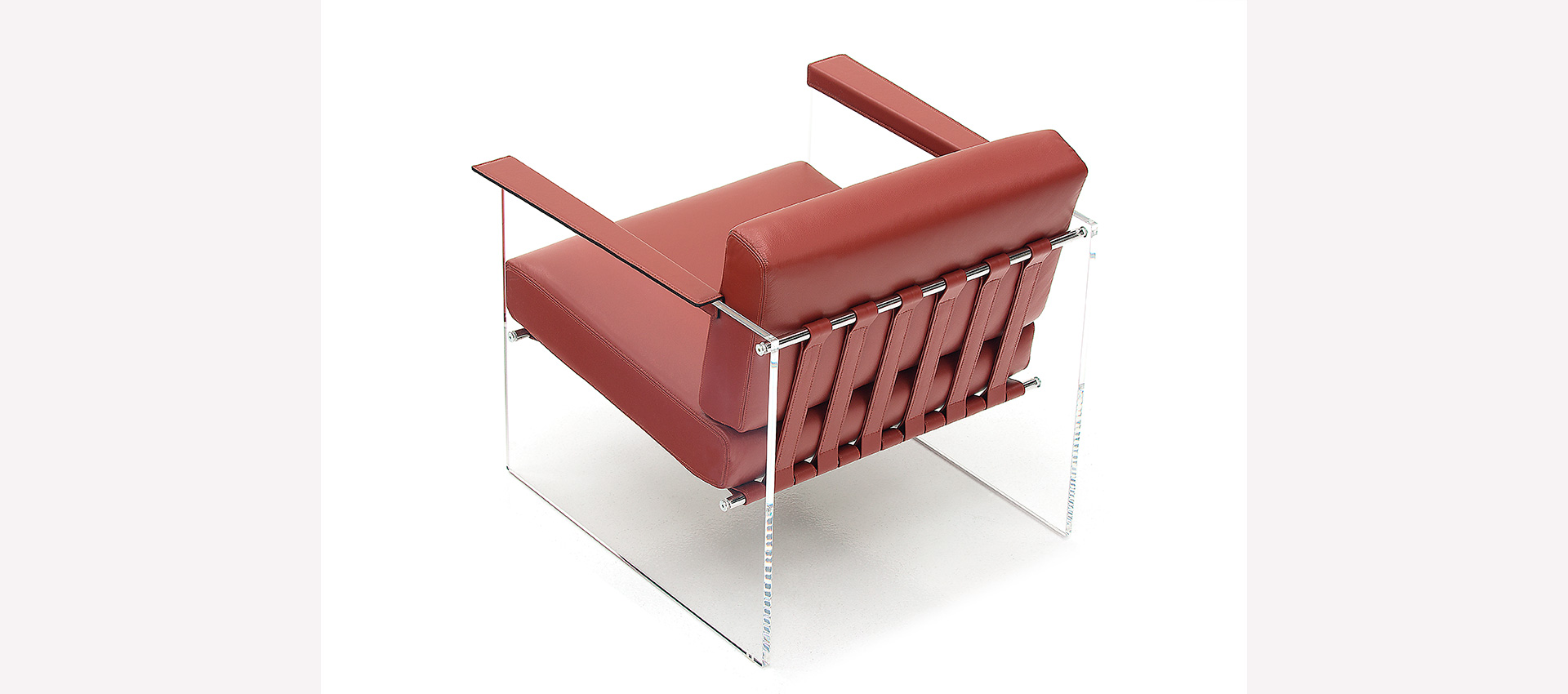 Armchair with frame in transparent acrylic glass (metacrilate) of mm. 15. Belts and cushions in soft leather.