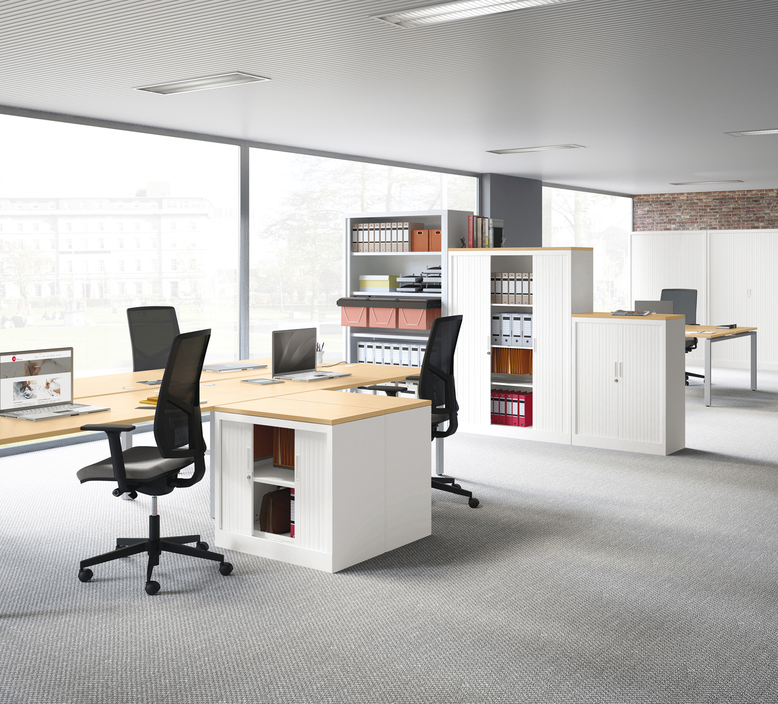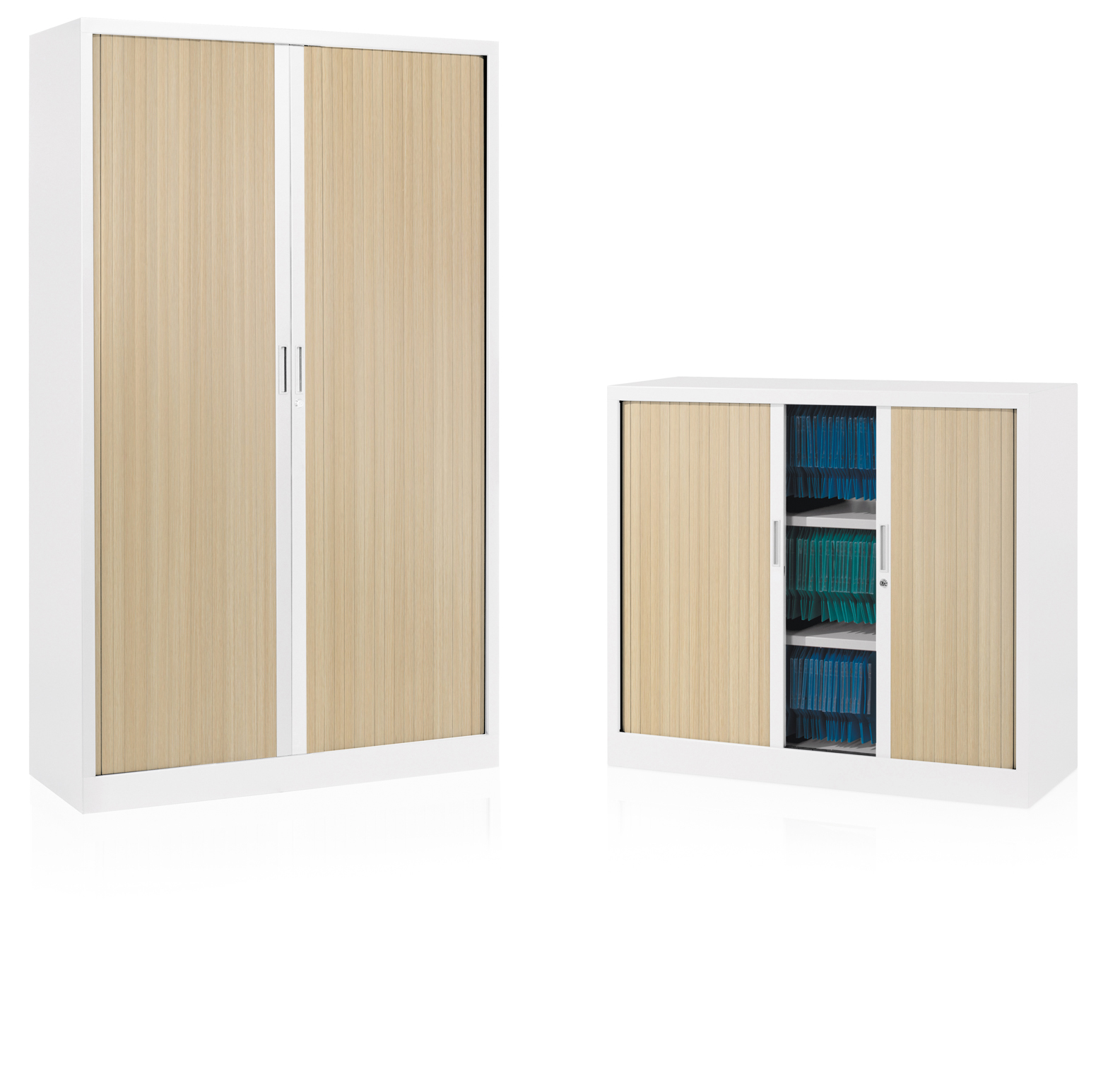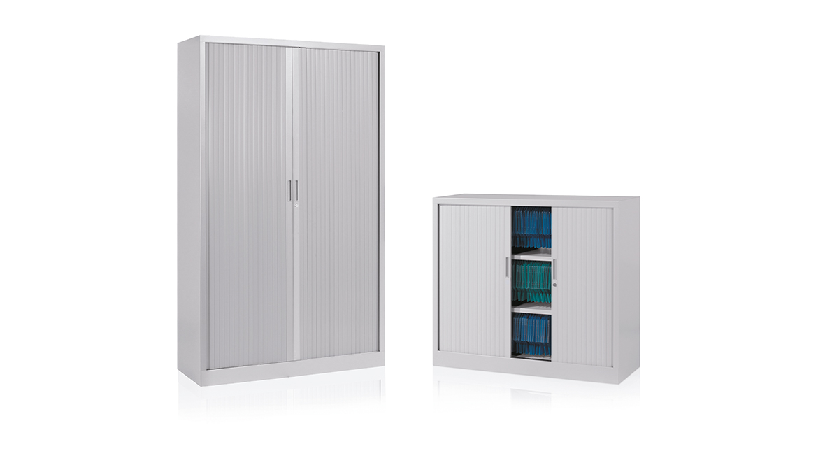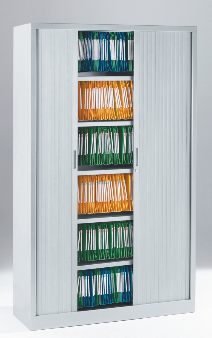 One-piece construction structure. Shelves in a matching finish to the cupboard shell. Terminal slat with integrated magnetic closing system. Shelves and cupboard tops fitted to receive suspension files.