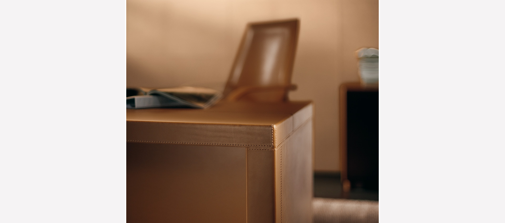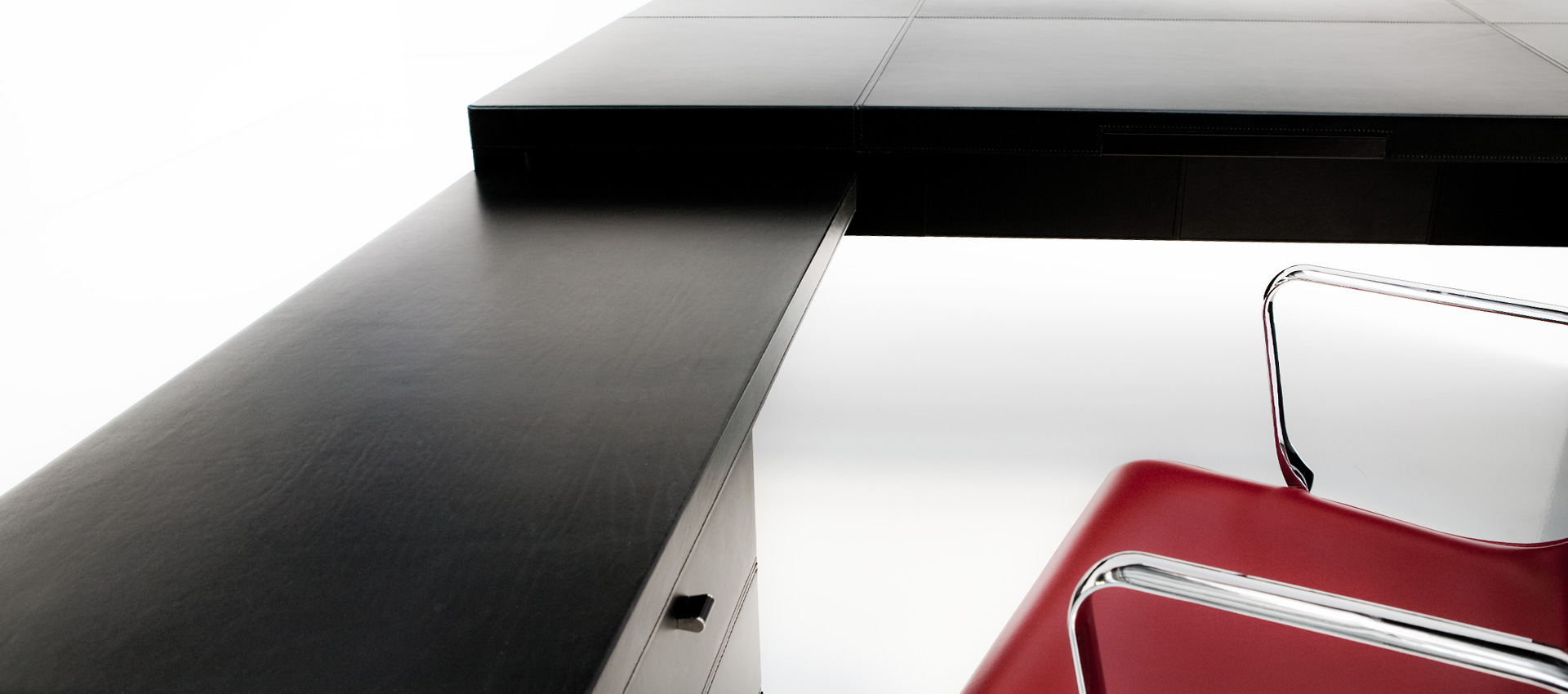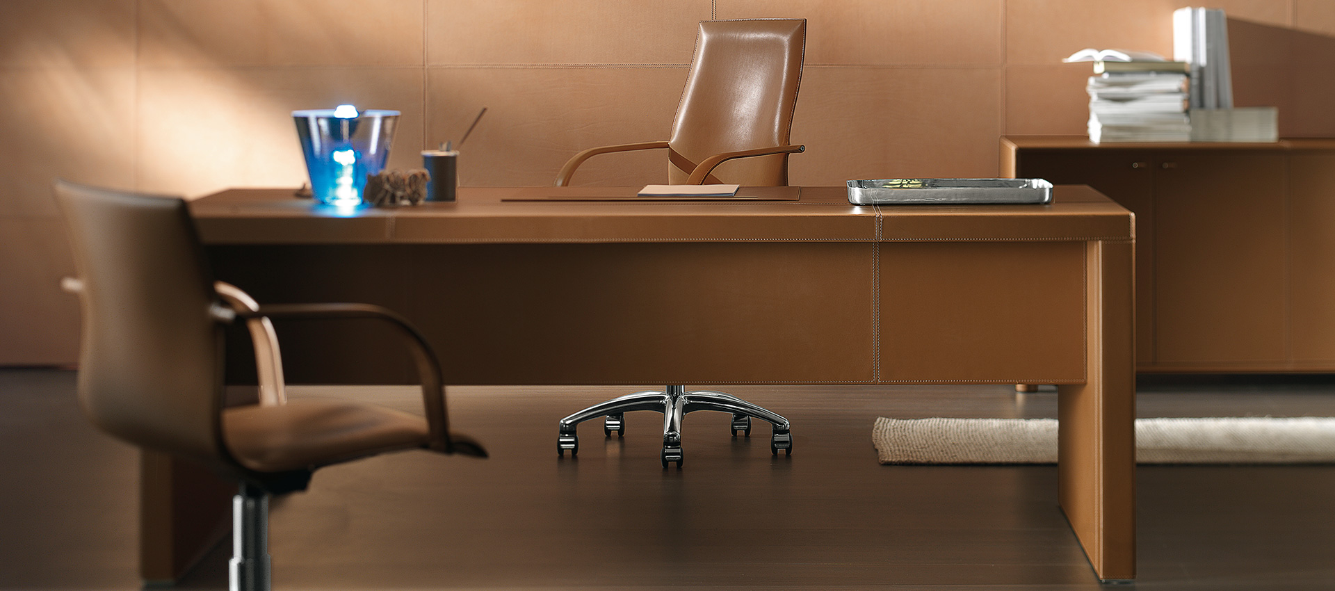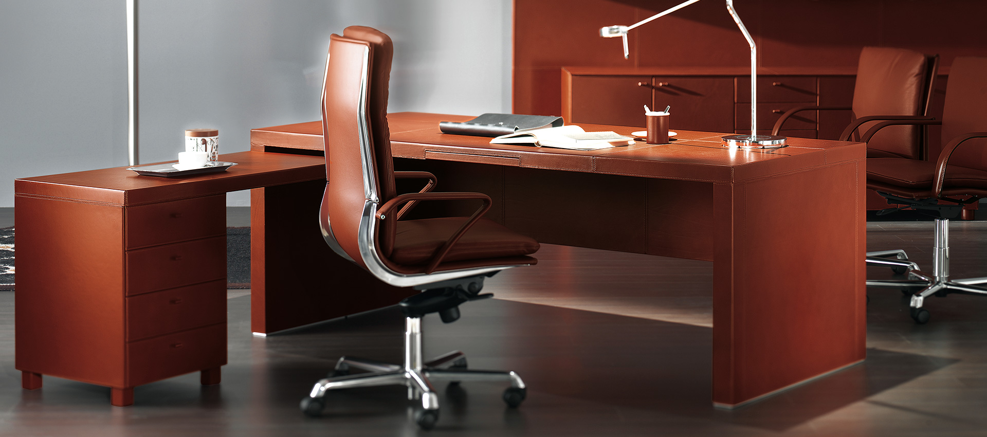 Executive desk with hard leather stationery drawer and bases with ducting for cable routing. Fully covered in hard leather. The Athena range also features storage units and bookcase panels, entirely covered with hide or leatherette.