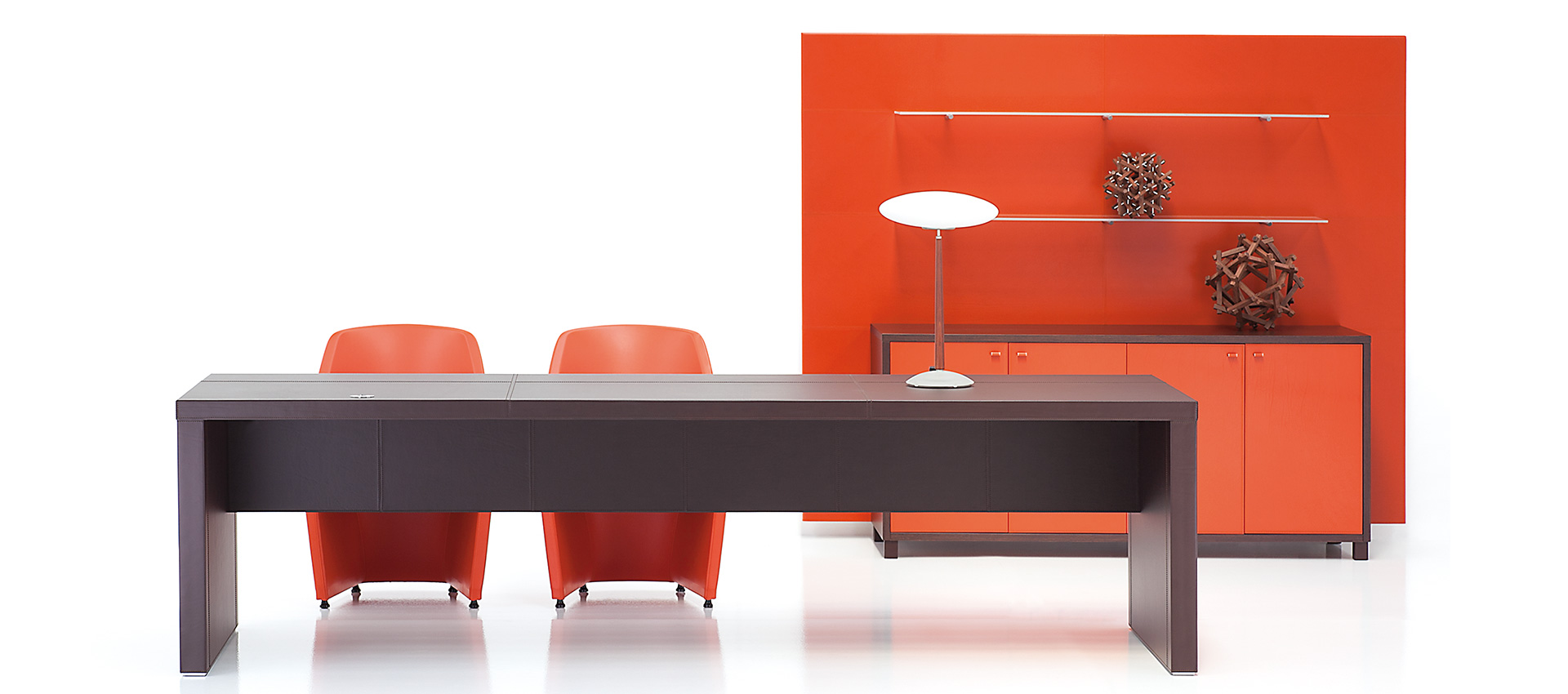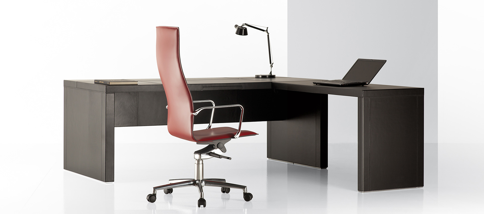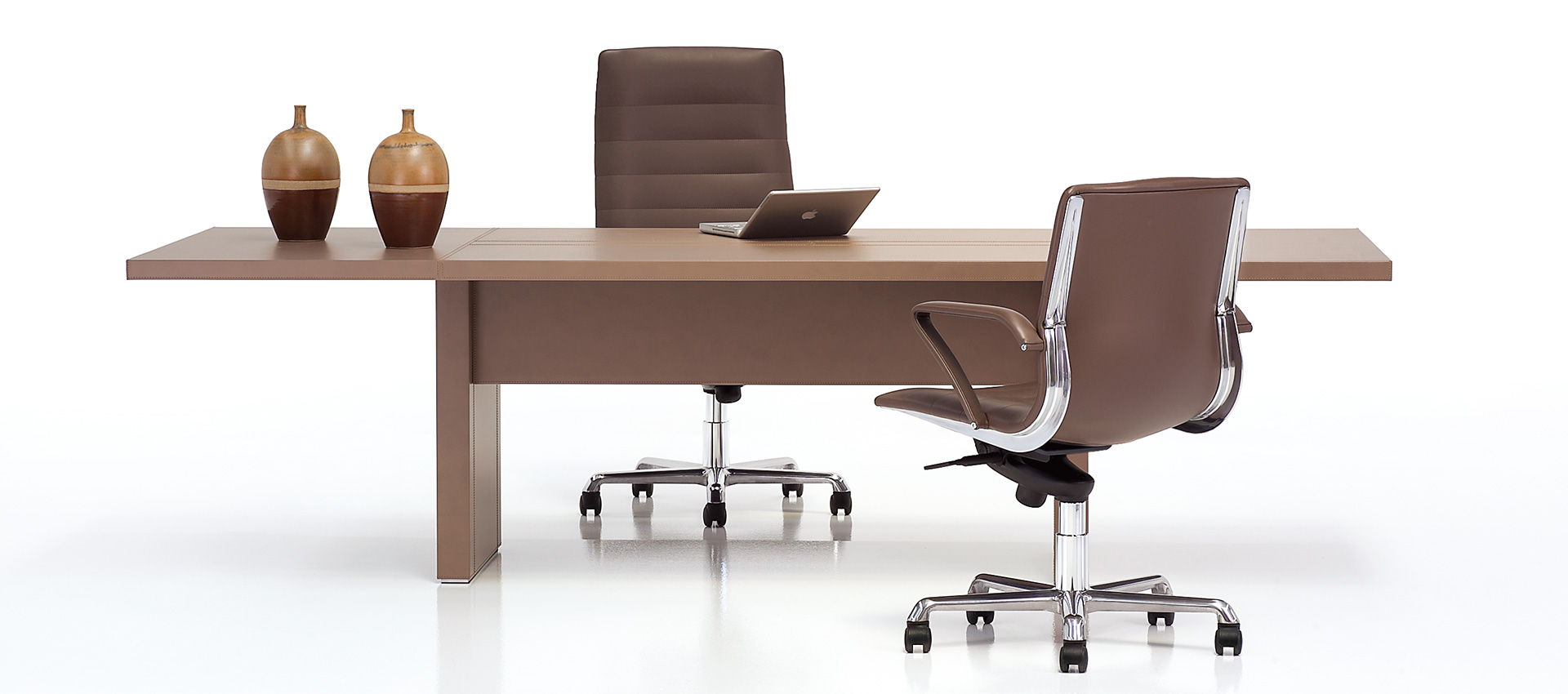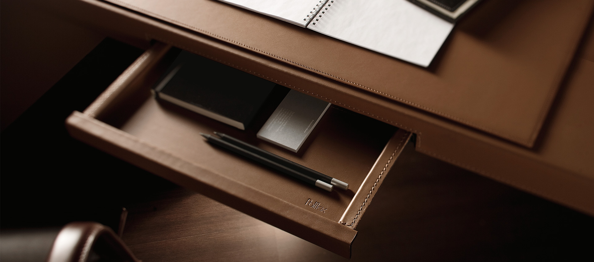 Executive desk with hard leather stationery drawer and bases with ducting for cable routing. Fully covered in hard leather. The Athena range also features storage units and bookcase panels, entirely covered with hide or leatherette.