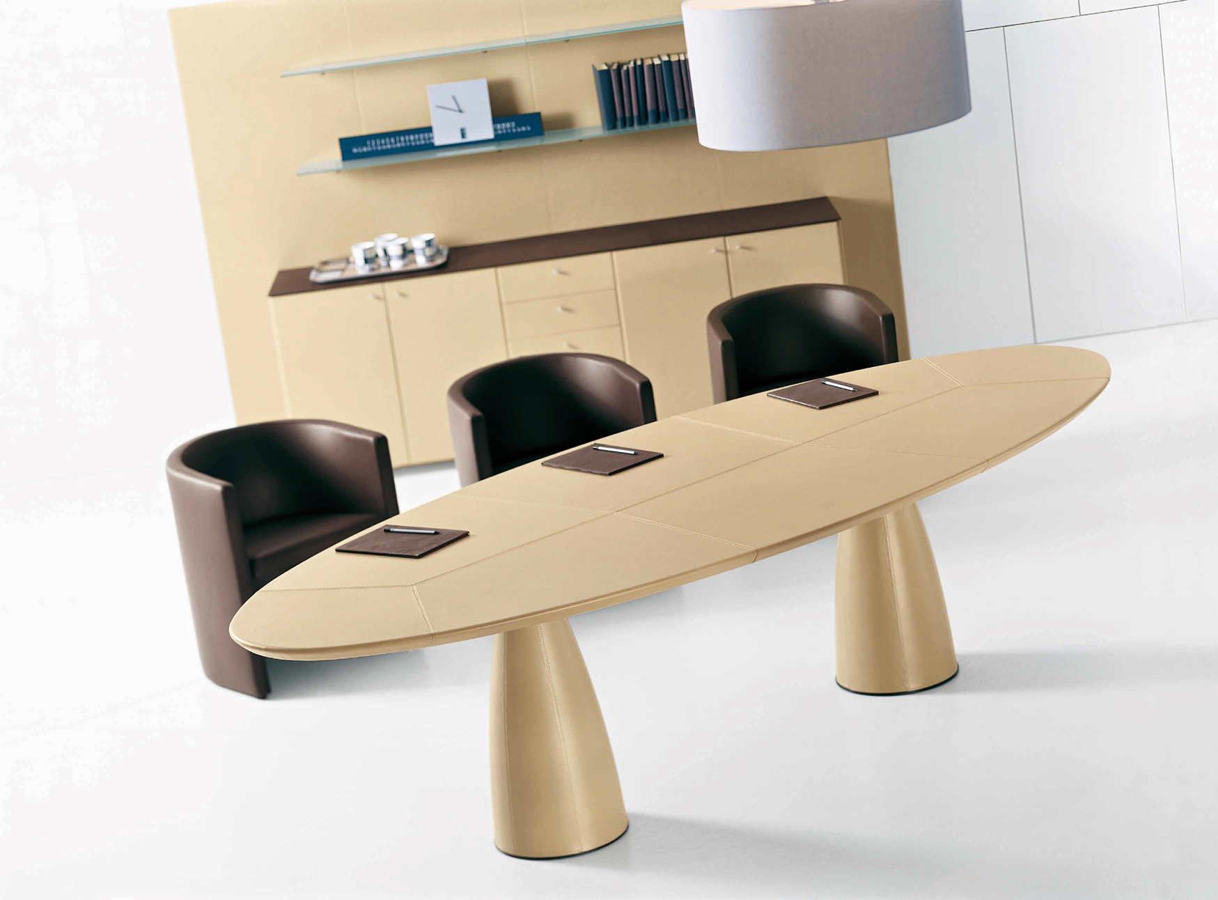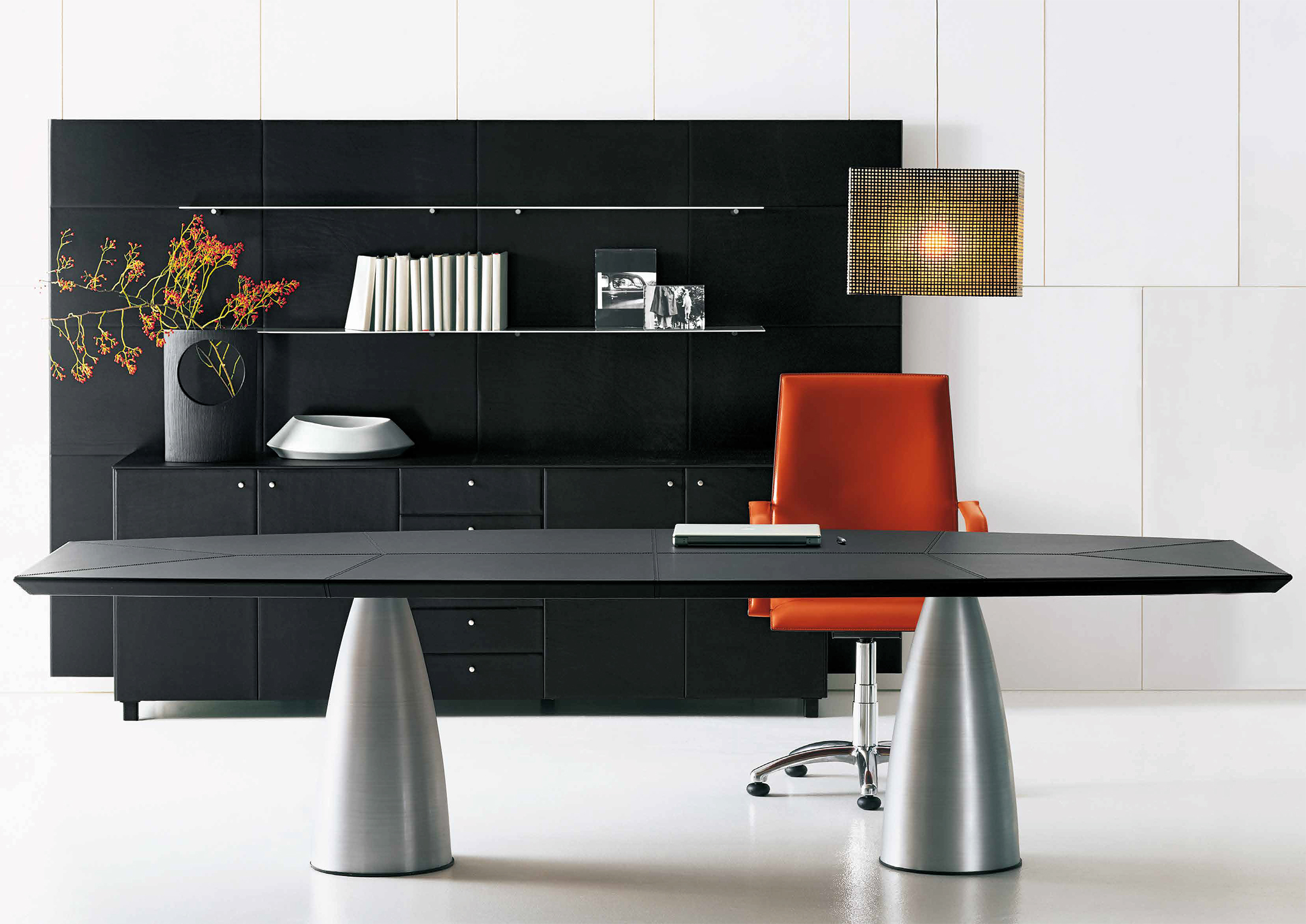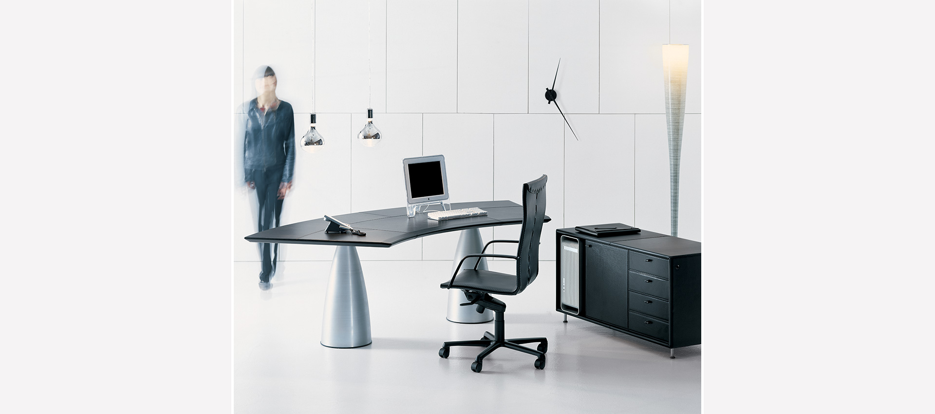 A collection of desks and conference tables with hard leather or glass tops. The bases are available in satin-finish aluminium or covered in hard leather. These desks and tables can be combined with the drawer and other cabinets from the Epico series.