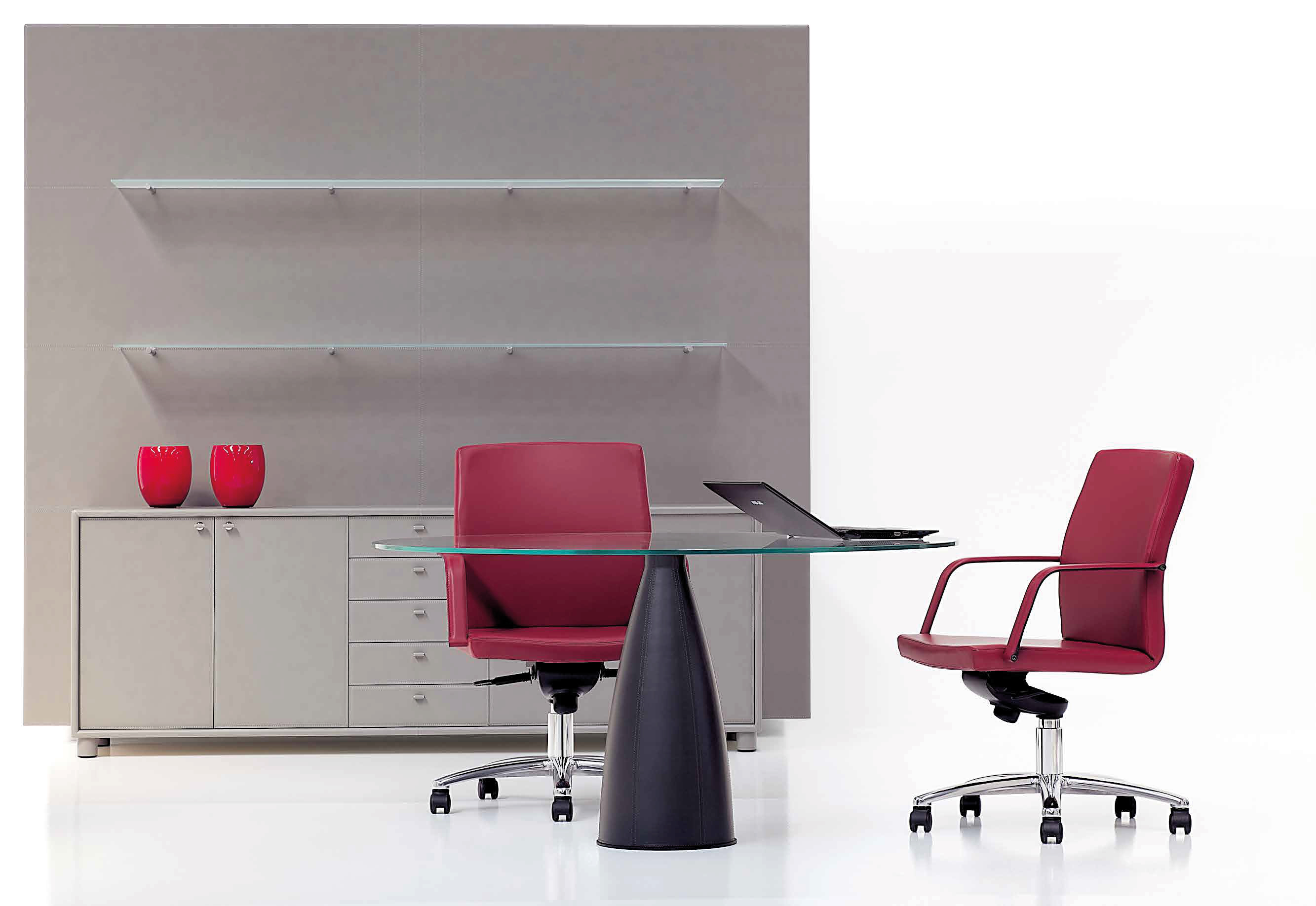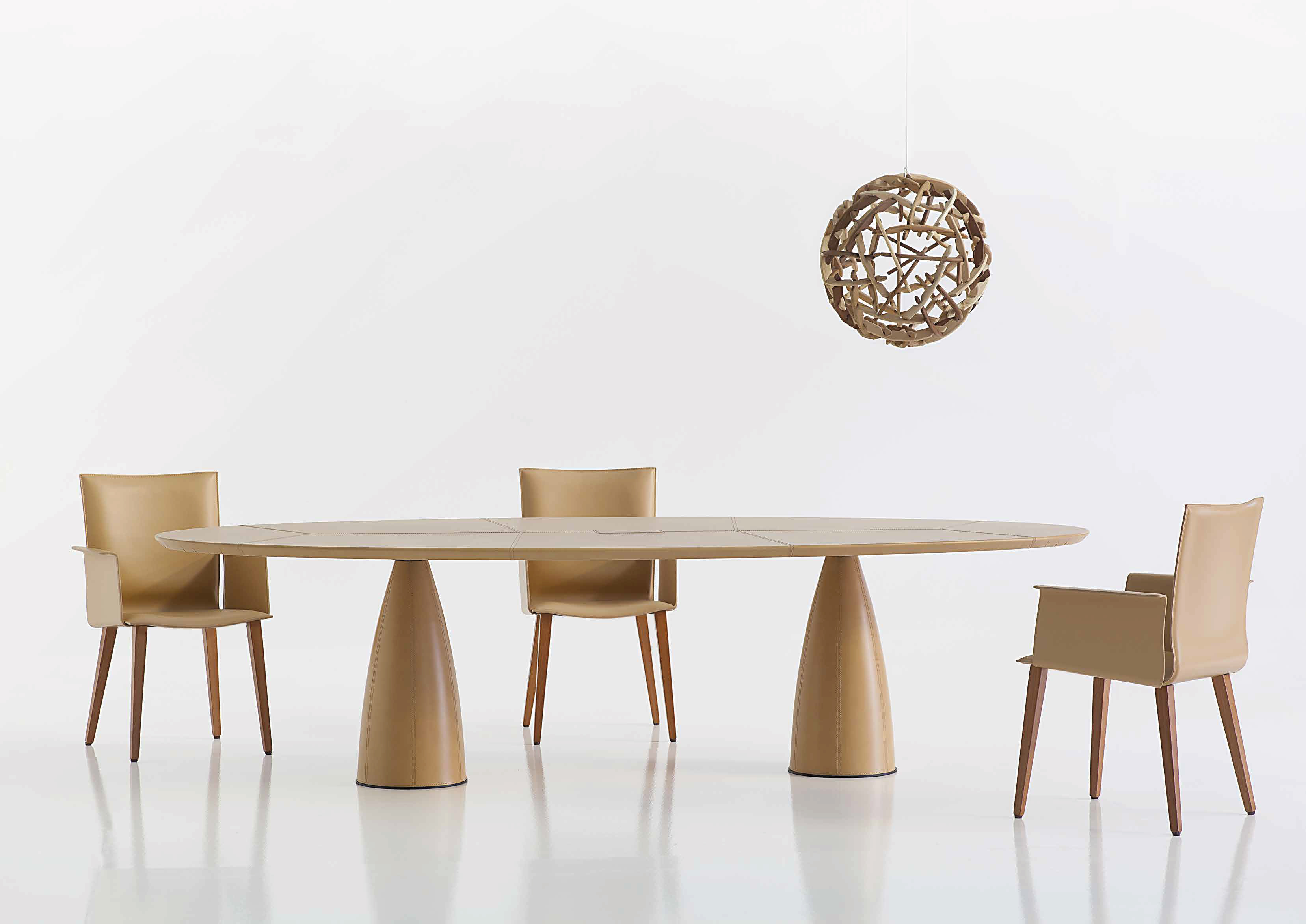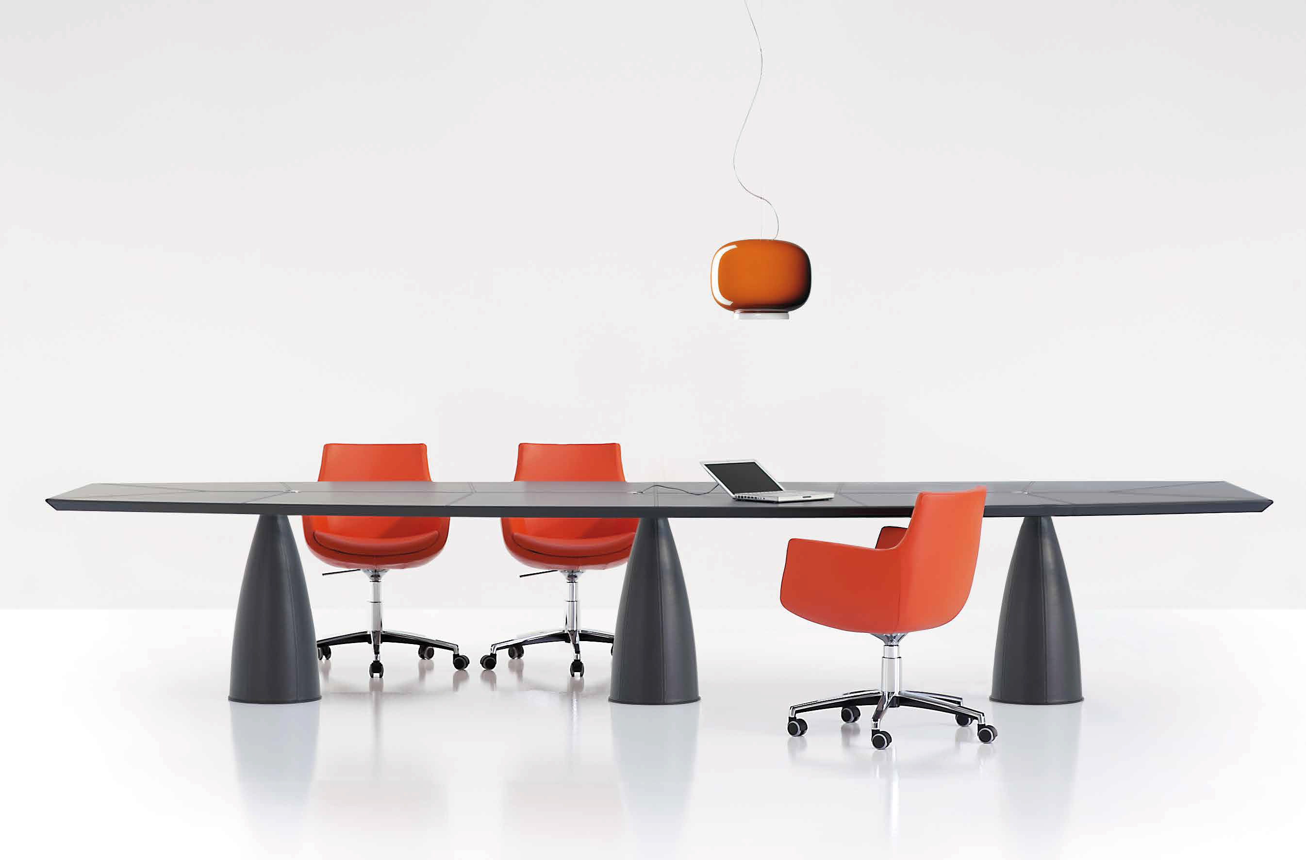 A collection of desks and conference tables with hard leather or glass tops. The bases are available in satin-finish aluminium or covered in hard leather. These desks and tables can be combined with the drawer and other cabinets from the Epico series.