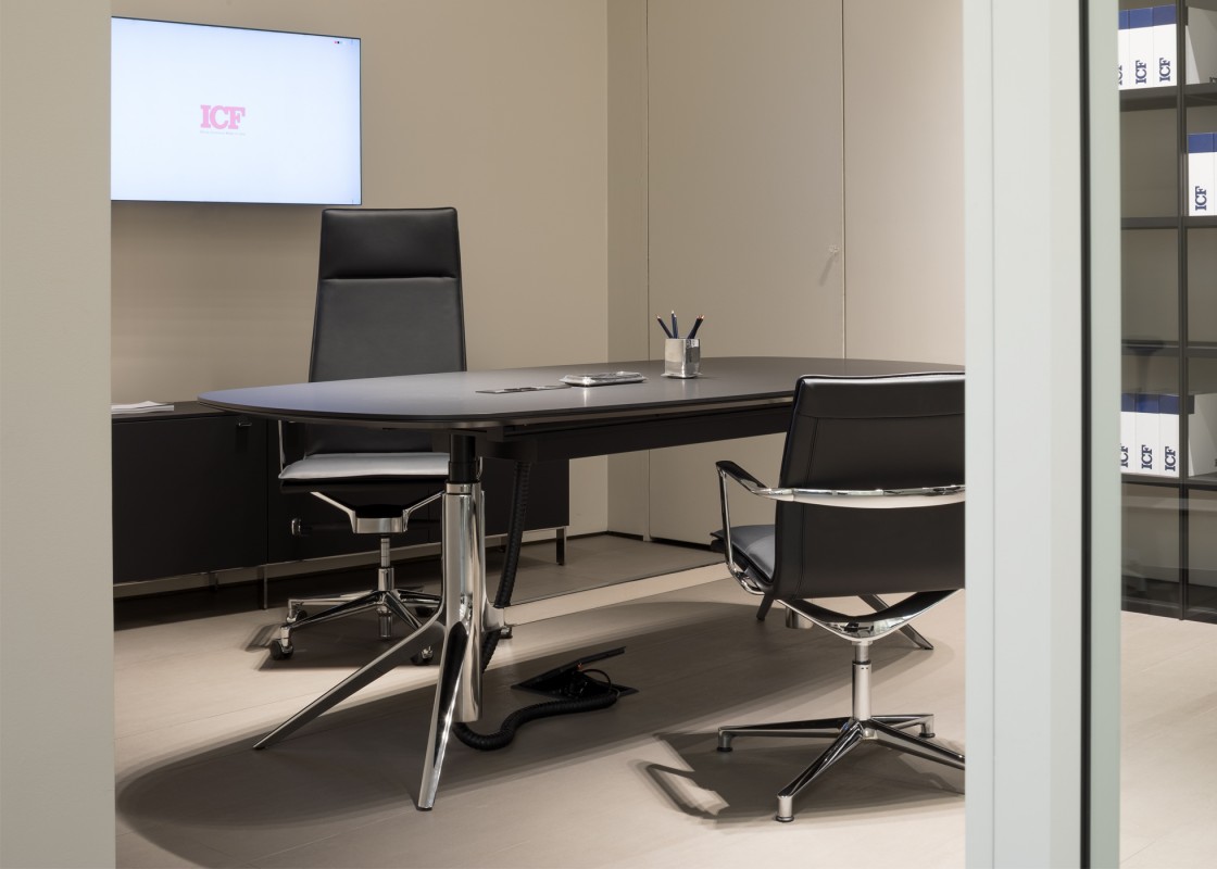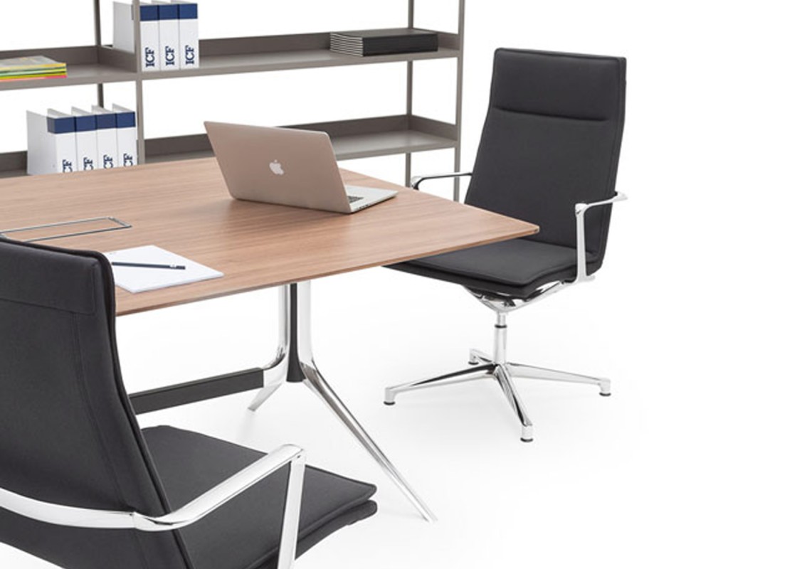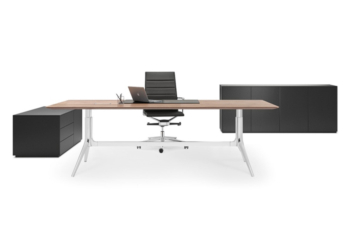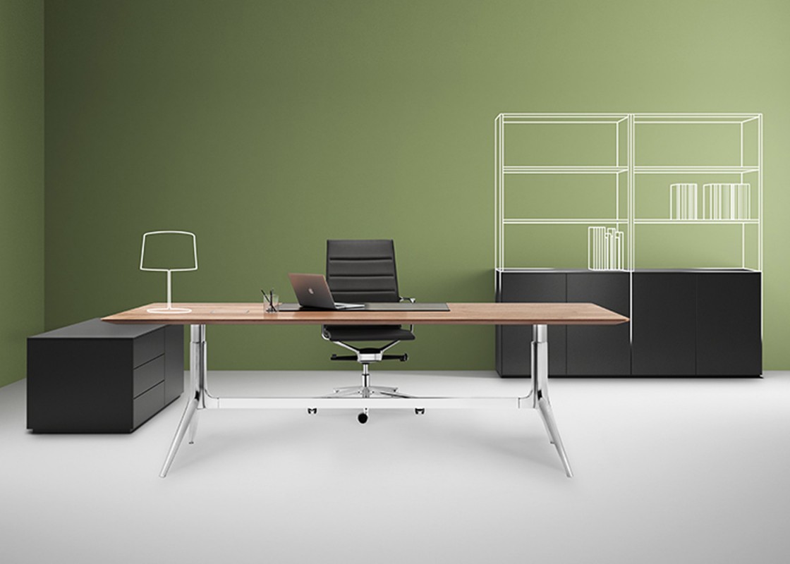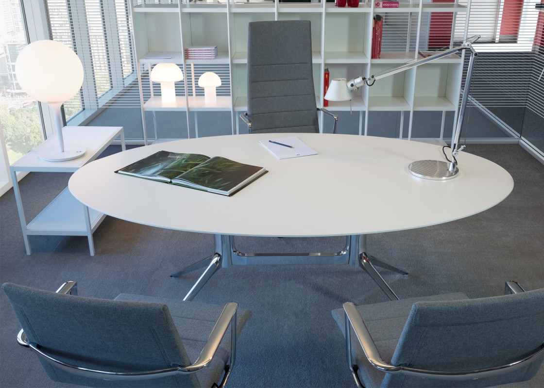 Every detail of NoTable speaks of subtle sophistication embodied by apparent simplicity. Die-cast aluminium legs stem dynamically from the floor to give the table its remarkable lightness. The legs are attached to a tubular vertical frame with an adjustable inclination that showcases the discrete yet high level engineering of NoTable. NoTable is a system that can assume a myriad of configurations. It can be an efficient and elegant single desk, or become a large table, designed to meet the need for modern areas where work groups can operate.