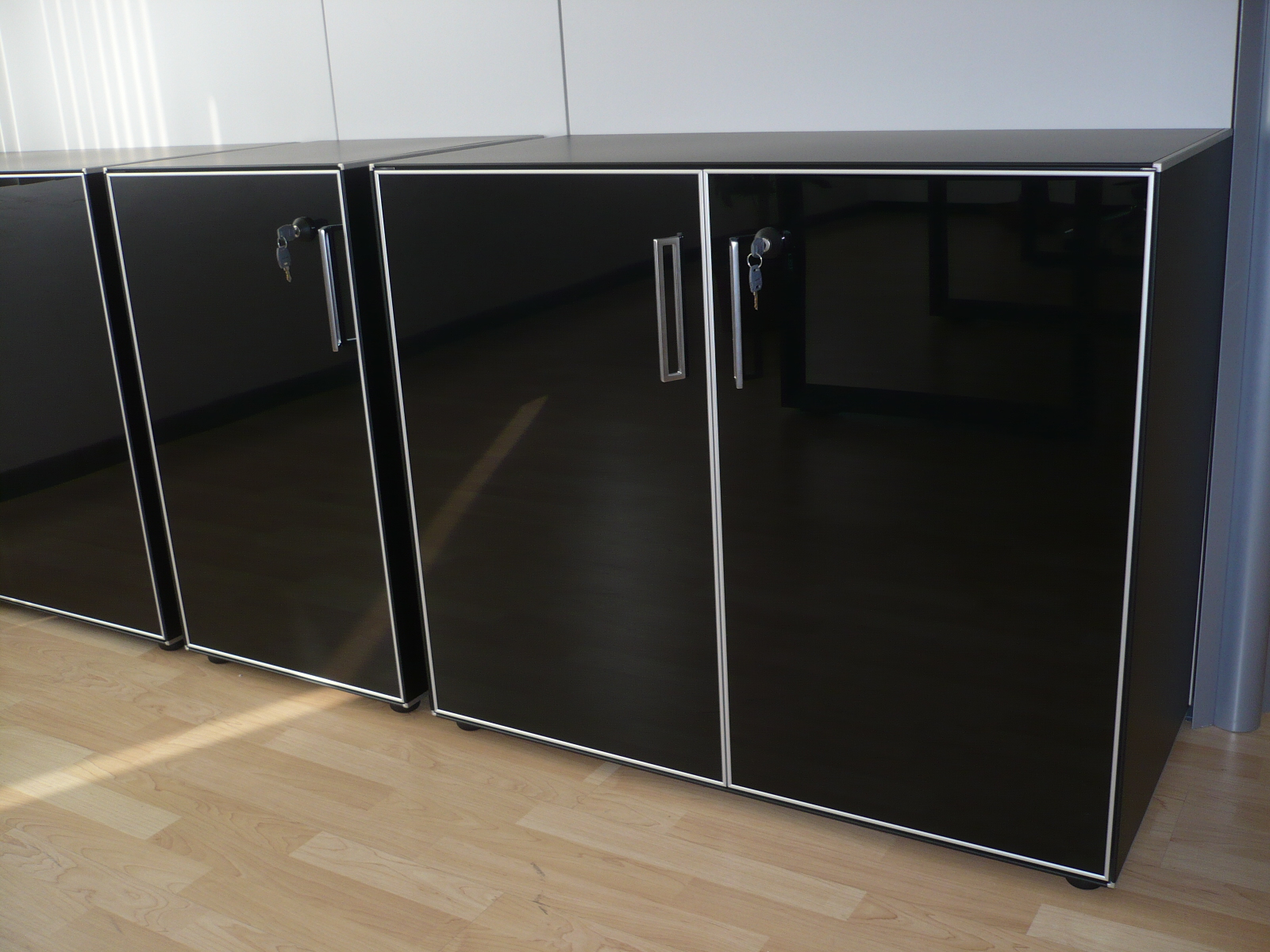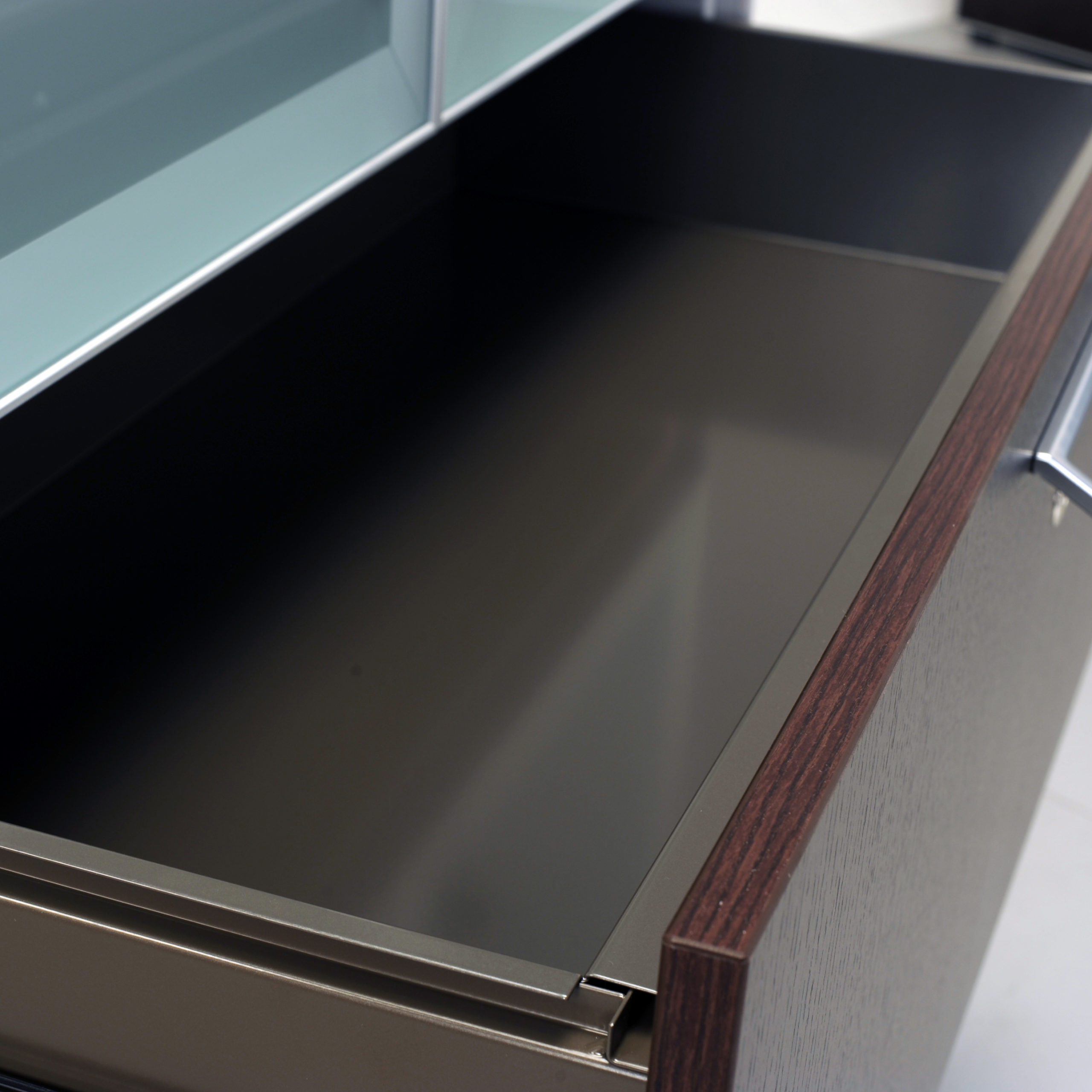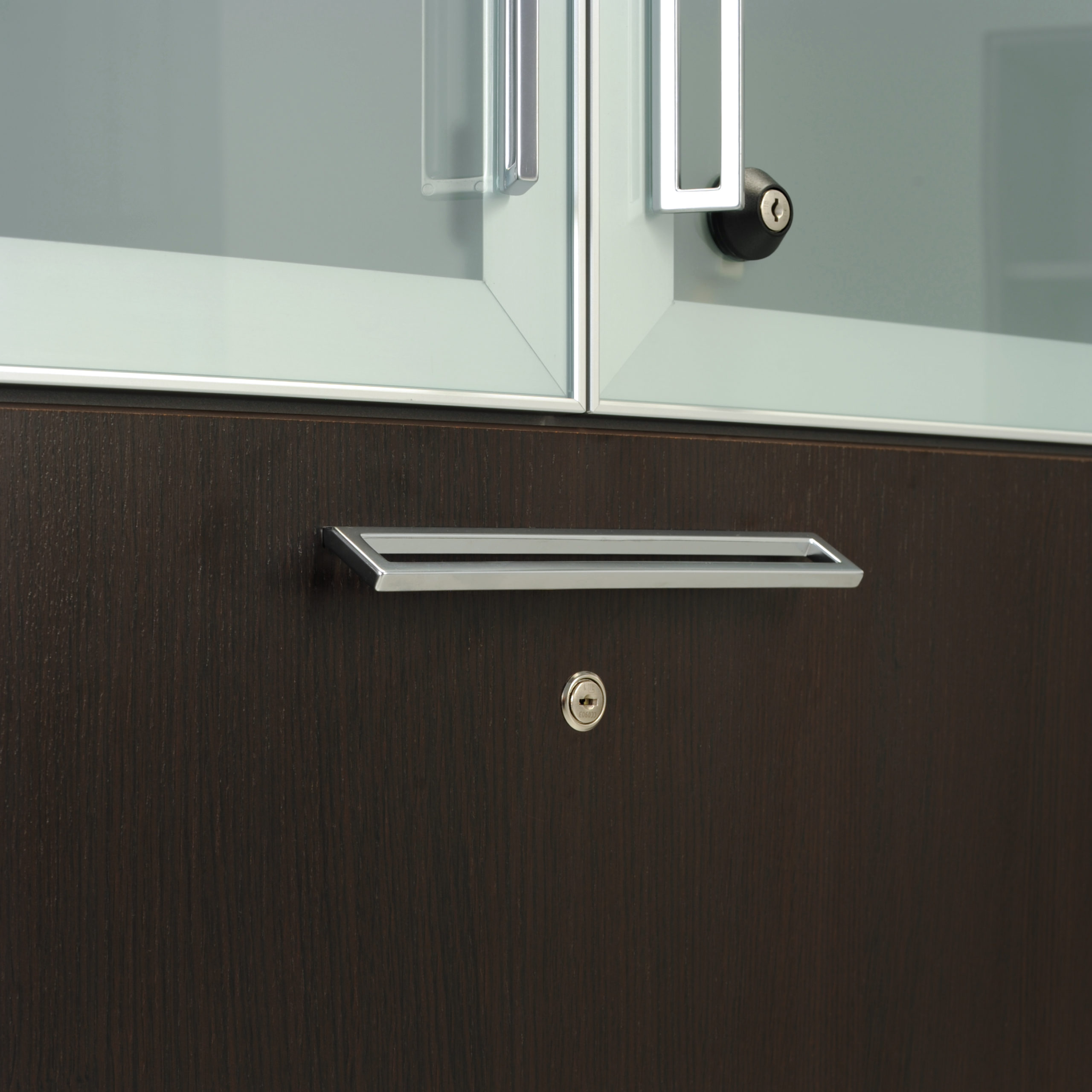The perimeter of the structure is made of top-quality metal sheet, painted, and protected by means of hot painting with epoxy-polyester powders, in four colours. Sides, back and cover are attached by means of 4 aluminium corner joints. Their particular shape, thin but long, makes it possible to fully fit the thickness of doors and back. On the back of the cabinet, there are some levelling pins, which perfectly level the piece of furniture after it has been assembled. Available in ecological wood. The doors can be made of frosted or coloured glass, assembled on the aluminium frame with a minimally visible profile. All the doors are equipped with safety locks.